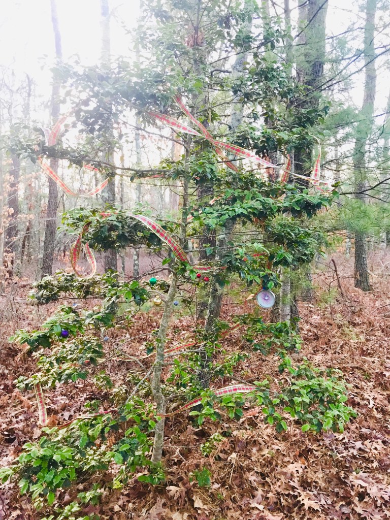 One day later, there was no snow left to be seen. It was 25 degrees, but not cold enough for us to skip our walk. I let my dog lead me down a familiar path. Up ahead I could see something shiny on one of the scraggly holly trees. It was purple. As I got closer, I could see that someone decorated this tree in the middle of the woods. There’s a long length of red plaid ribbon wrapped around and around, and shiny Christmas spheres hooked on a dozen branches. It made me smile in a way that’s hard to describe. I felt emotional all of a sudden, by myself in the woods, and then I had to laugh. I didn’t expect the reaction, this sudden upswell of emotion. I kept smiling long after I passed the tree.